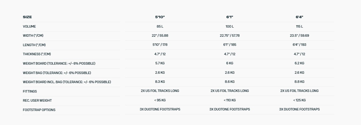 Disponible en trois tailles – 5'10" (85L), 6'1" (100L) et 6'4" (115L) – la Skybrid Air répond à une grande variété de styles et de conditions. Chaque planche est accompagnée d’un sac de transport et de notre pompe innovante tout-en-un, compatible à la fois avec votre planche et votre aile, pour simplifier la logistique et le gonflage.
