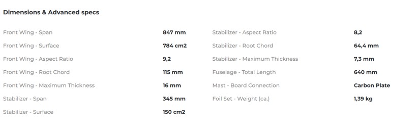 Stabilizer - Span 380 mm Stabilizer - Surface 178 cm2 Stabilizer - Root Chord 61,72 mm Stabilizer - Aspect Ratio 8,08 Stabilizer - Maximum Thickness 6,85 mm Stabilizer - Volume 76 cm3 Stabilizer - Weight (ca.) 109 g Stabilizer - Material Full Carbon (coreless)